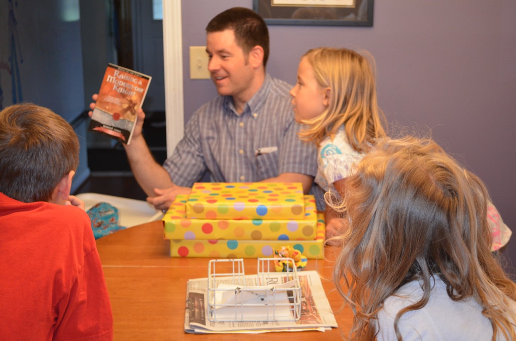 He got a cool new Crown of Thorns tie, two shirts, and two books. One was by Dr. David Jeremiah on the upcoming economic Armageddon, and the other was a Focus on the Family book on Raising Knights. The kids were a little dubious about his spoil. It seemed to be a little lacking. ![]()